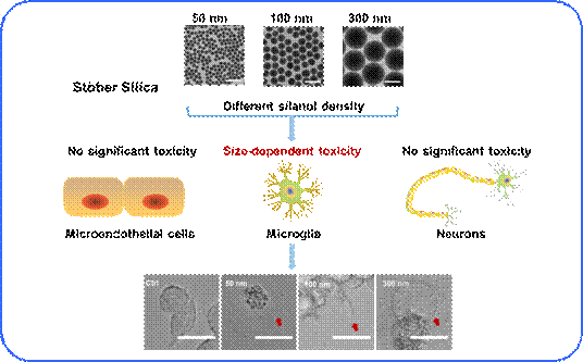 近日,大连理工大学化工学院孙冰冰教授课题组使用不同的神经毒性研究模型:微血管内皮细胞bEnd.3,小胶质细胞N9,海马区神经元HT22,对Stöber二氧化硅的神经毒性进行评估,并探究其毒性机理。研究发现,三种细胞得到的毒性结果不同:Stöber二氧化硅对N9细胞造成了显著毒性,且毒性随着纳米粒子的尺寸的减小而增大,另一方面,对bEnd.3和HT22细胞无明显的毒性。机理探究发现,Stöber二氧化硅引发小胶质细胞线粒体活性氧的产生以及溶酶体的破损,导致促炎细胞因子IL-1β的释放。另外,小胶质细胞出现细胞肿胀、细胞膜鼓泡现象,并表达氮端GSDMD蛋白(N-GSDMD),证明Stöber二氧化硅引发小胶质细胞出现细胞焦亡。进一步研究显示,硅羟基在Stöber二氧化硅的毒性中发挥了关键作用,降低硅羟基的含量后,对小胶质细胞中的毒性显著降低。