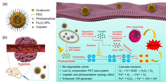 可生物降解的卵清纳米胶囊包含I型光动力光敏剂(NBS),顺铂药物和用于芬顿(Fenton)反应的Fe3O4纳米颗粒。通过条件优化,上述三种功能试剂均可包裹于卵清纳米粒子内部,并展现出很高的共包封效率。即使在严格的低氧环境下(2% O2),光敏剂NBS仍具有优异的I型PDT功效。即在光照下,PDT产生超氧阴离子,并在超氧化物歧化酶(SOD)的催化下转化为H2O2,然后经Fe3O4纳米颗粒介导的芬顿反应过程中转化为剧毒的•OH同时释放O2。因而,该过程可实现氧气的循环利用,克服缺氧对PDT效率的影响。另外,PDT过程促进了药物(顺铂,临床抗癌药)的溶酶体逃逸,使抗癌药物高效向核内递送。同时,在烟酰胺腺嘌呤二核苷酸磷酸氧化酶(NOX)的存在下,顺铂也会产生超氧阴离子,可起到补充•OH的作用进一步以提高治疗效率。由于PDT与化疗的协同作用,该卵清蛋白纳米颗粒在缺氧耐药肿瘤的治疗中展现出优异的效果。这一策略有望用于增强抗癌治疗。