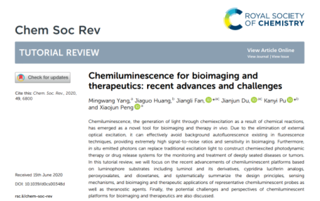 精细化工国家重点实验室樊江莉教授和新加坡南洋理工大学浦侃裔副教授合作,在国际著名综述类期刊 Chemical Society Reviews 上发表题目为“Chemiluminescence for bioimaging and therapeutics: recent advances and challenges”的Tutorial Review综述文章()。
