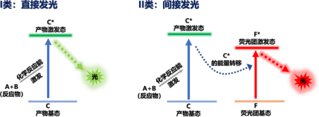 化学发光主要由化学激发过程和发光过程两部分组成。根据能量作用过程,化学发光主要分为直接发光和间接发光两类。直接发光:反应物A和B发生化学反应,释放出的化学能产生部分处于激发态的C*和其它物质D,激发态C*弛豫返回其基态C时直接发出可检测的光信号。间接发光:反应物A和B同样发生化学反应产生激发态中间体C*,C*通过能量共振转移的方式将其能量转移给体系中存在的荧光团F,荧光团F吸收能量后由基态跃迁至激发态F*,F*以光辐射的方式返回基态F。通常该类化学发光的波长与荧光团F的荧光发射波长相一致。