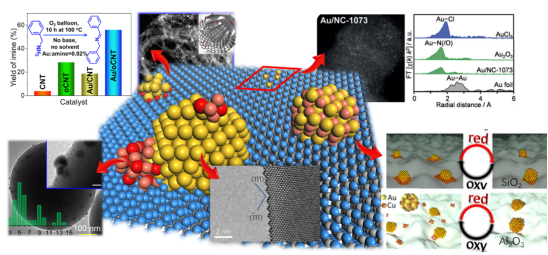 近年来,研究学者将负载型金催化剂的应用视为多相催化工业化进程中的机遇和挑战,进行了广泛的研究。载体的选取可以有效调控纳米金催化剂的化学结构及催化活性。针对载体本身对反应是否具有活性,可将金催化剂的载体分为活性载体与惰性载体。其中惰性载体,诸如碳基材料、氧化硅、氧化铝等,多为反应条件下不具备还原性或不可进行还原处理的材料,不释放活性氧物种,通常对反应亦不具备催化活性。一般情况下,以传统不可还原性材料负载Au NPs时,若非采用特殊的优化手段,该类金催化剂的活性及稳定性通常差强人意。尽管如此,不可还原材料作为惰性载体,亦展现出无与伦比的独特优势,例如其多具有易于调控的表面性能、可调变的多样化微观结构,丰富的地壳储量和易于大规模产业化的优势等。因此,针对不可还原材料负载的纳米金催化剂,探讨创新性的改性手段及其对金催化剂活性与稳定性的理性调控,成为近年来纳米金催化领域中最引人入胜的研究课题之一。