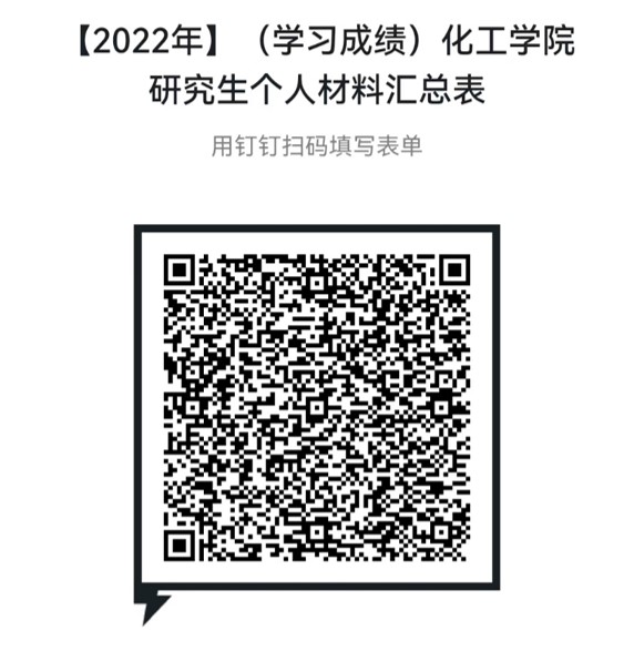 (一)线上申报:请按照如下流程填写线上申报,钉钉-工作台-远程办公-填写“【2022年】(学习成绩)化工学院研究生个人材料汇总表”或使用钉钉扫描图片中二维码,所有内容与附件7《个人材料汇总表》一一对应,线上申报只填写学习成绩部分。