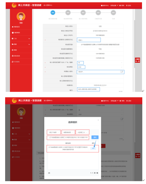 选择组织:团辽宁省委-省管高校团委-大连理工大学团委-输入组织全称
