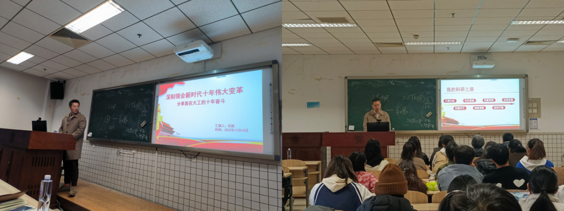 吴越同志从深刻领会新时代十年伟大变革出发,结合自身求学经历,分享了自己在大工十年的奋斗历程,从兴趣、到夯实基础,从细致观察到创新思想,经过不懈的坚持,最终自身得到了全面发展。最后他告诉同学们要有解决问题的必胜决心,时刻保持对科研的热情,以昂扬的斗志,砥砺前行。