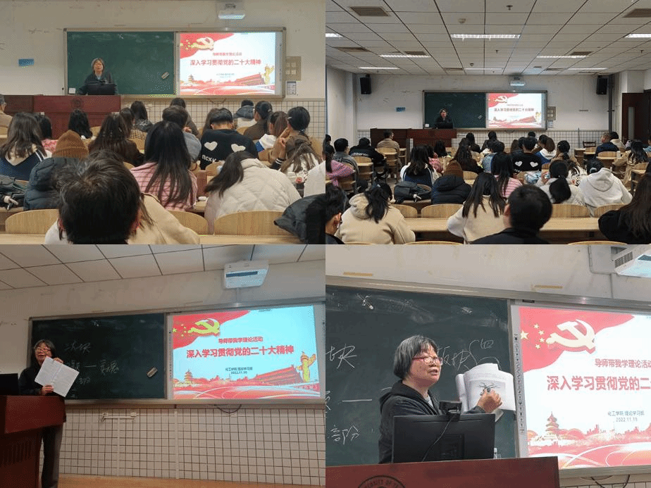 为深入学习贯彻党的二十大精神,进一步强化理论武装,切实把党的二十大精神融入思想中、落实在岗位上、体现到行动中。化工学院精细化工博硕第二学生党支部于2022年11月19日下午13:30在知化楼B202举办了“导师带我学理论-深入学习贯彻党的二十大精神”主题讲座。本次讲座邀请了党建指导教师赵秋娜老师,精细化工博硕第二学生党支部书记闫营营,校优秀博士研究生标兵、国家奖学金获得者吴越同学为大家讲党课。