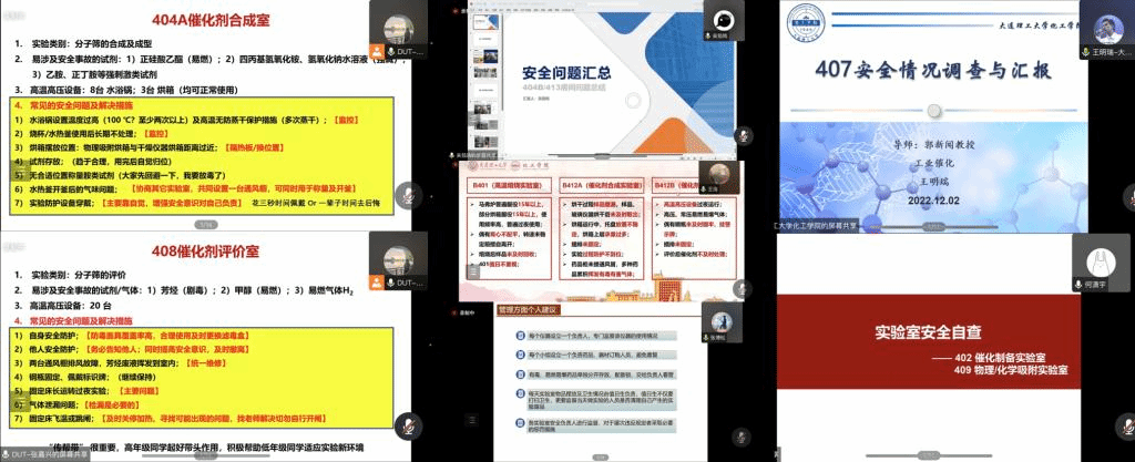 为提高课题组研究生安全意识,防止科研试验事故发生,大连理工大学化工学院郭新闻课题组成立了以党员同志为主的实验室安全负责小组,并在线上开展“防微杜渐,警钟长鸣”实验室安全大讨论暨工业催化博第二学生党支部实验室安全教育主题党日活动,活动由博士研究生张嘉兴主持,师生共计105人参加。