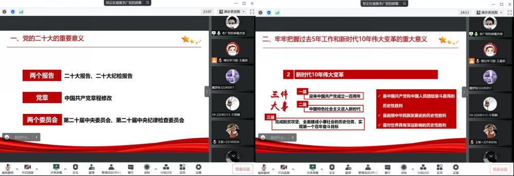 首先,李广哲老师以“以中国式现代化推进中华民族伟大复兴”为题,通过解读党的二十大报告,让我们更深刻的把握了党和人民今后的奋斗方向,进一步明确了奋斗目标。报告过程中,李老师谈到,党的二十大的重要意义不仅仅体现在对《中国共产党章程》进行了相应修改,更体现在其两个“确立”:一是确立习近平同志党中央的核心、全党的核心地位,二是确立习近平新时代中国特色社会主义思想的指导地位。随后,李老师以“牢牢把握过去5年工作和新时代10年伟大变革的重大意义”为媒介,着重为我们讲解了新时代10年的伟大变革,重温党的二十大报告,让我们再度感叹国家的强盛与民族的兴旺。