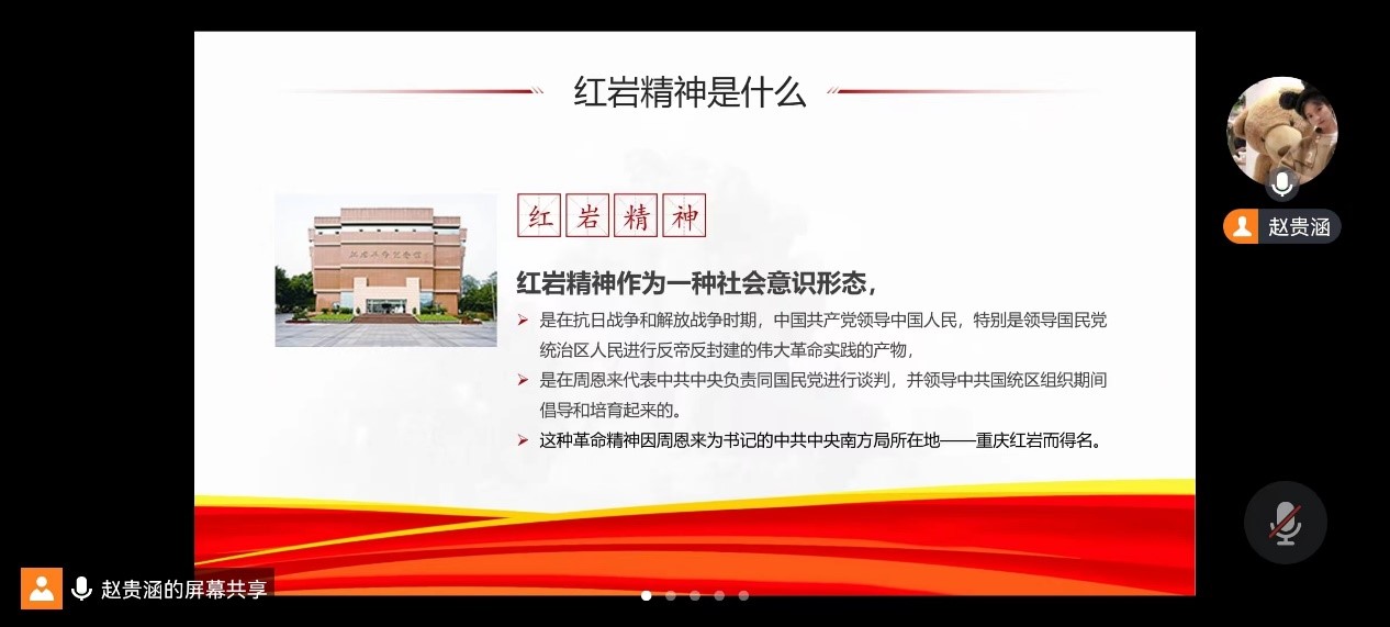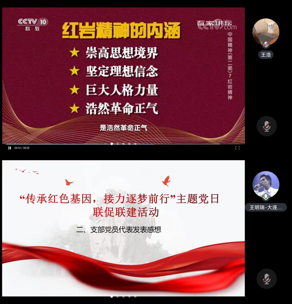 新疆大学化工学院研究生第一党支部的高倩倩同志与大连理工大学化工学院工业催化博第二学生党支部的王明瑞同志,结合学习内容与自身感悟进行分享交流。王明瑞同志表示:“红岩精神是老一辈革命家留下来的宝贵的精神财富,他们牺牲小我成就大我的革命英雄主义精神和英勇的奉献精神值得我们认真学习并不断传承。”活动最后,工业催化博第二学生党支部书记王浩同志表示:“通过此次活动,两支部云端共聚,联建联促,围绕学习红岩精神,传承红色基因深入开展主题党日活动,使每位与会同志都对革命先烈坚定的爱国精神和不怕困难的勇于奉献精神有了更为深刻的理解,希望我们每个人都能学思用贯通,做坚定的红色基因传承者、宣传者。”