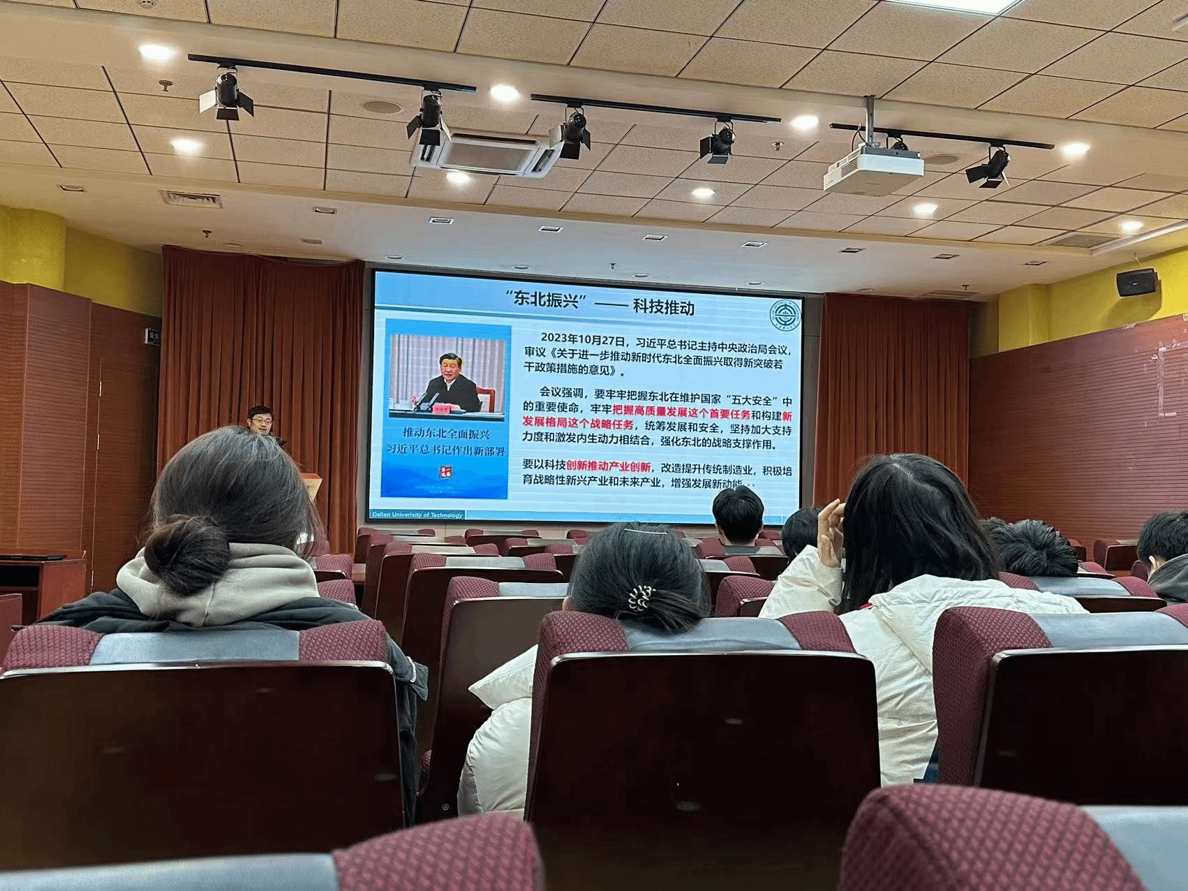 首先,毛庆老师以“加强基础研究,夯实科技自立自强根基”为主题,详细解读了习近平总书记在中央政治局会议上对于推进东北全面振兴作出的新部署。毛庆老师围绕“以科技创新推动产业创新”这一基本点展开讲解,提出科技的进步是国家自立自强的根基,化学工程/电化学工程是东北未来战略性新兴产业发展的主要技术支撑,希望同学们担当起这份使命。