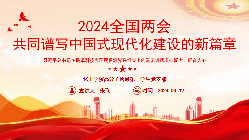 思想就是旗帜,旗帜指引方向。为深入学习贯彻全国两会精神以及全面学习领会习近平新时代中国特色社会主义思想,2024年3月12日,高分子博硕第三学生党支部在知顺楼A102召开学习习近平总书记在民革科技界环境资源界联组会上的重要讲话精神,支部全体党员、入党积极分子参会,支部书记朱飞同志为大家讲党课。通过集体学习的方式,让习近平总书记重要讲话精神入心入脑,为推进中国式现代化建设汇聚青春力量。