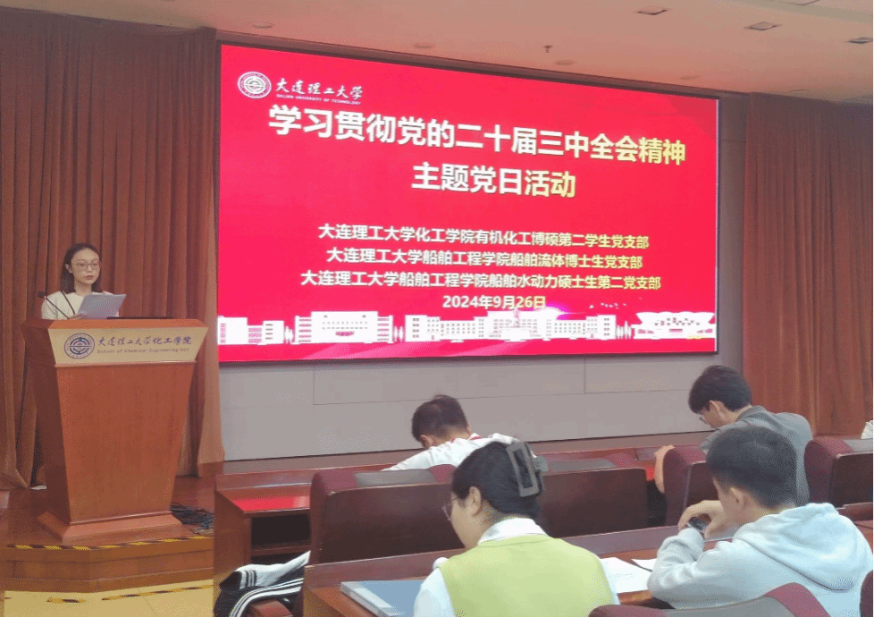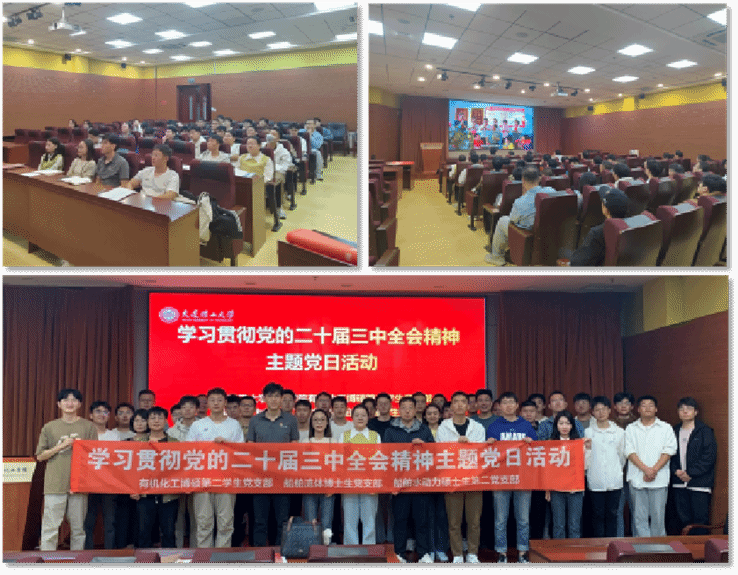 为进一步深入学习贯彻党的二十届三中全会精神,高质量推进研究生党支部的交流共建,9月26日,化工学院有机化工博硕第二学生党支部与船舶工程学院船舶流体博士生党支部、船舶工程学院船舶水动力硕士生第二党支部在知化楼D102开展学习党的二十届三中全会精神主题共建。化工学院党委组织员王玉健老师和船舶工程学院党委组织员王亚澜老师出席会议。