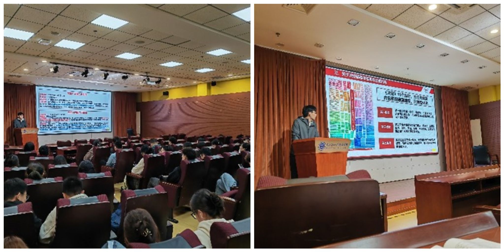 接着是博士研究生高碧泽师兄为我们带来了他对于“一融双高”--党建与科研的理解与感悟。高师兄首先向我们讲解了中国航天事业奠基人钱学森先生、中国载人航天工程总设计师周建平对于航天事业作出的贡献,以中国长征系列运载火箭的发展历程向大家介绍了中国航天事业的发展。在场参会人员不仅受到了精神上的鼓舞,也获得了科研方面的指导和帮助。高师兄提到:“党建与科研之间存在着内在的联系和辩证关系,它们可以相互促进、相互支撑、实现共同发展。”鼓励研究生们要充分理解并学习载人航天精神,奋发向上,勇往直前。
