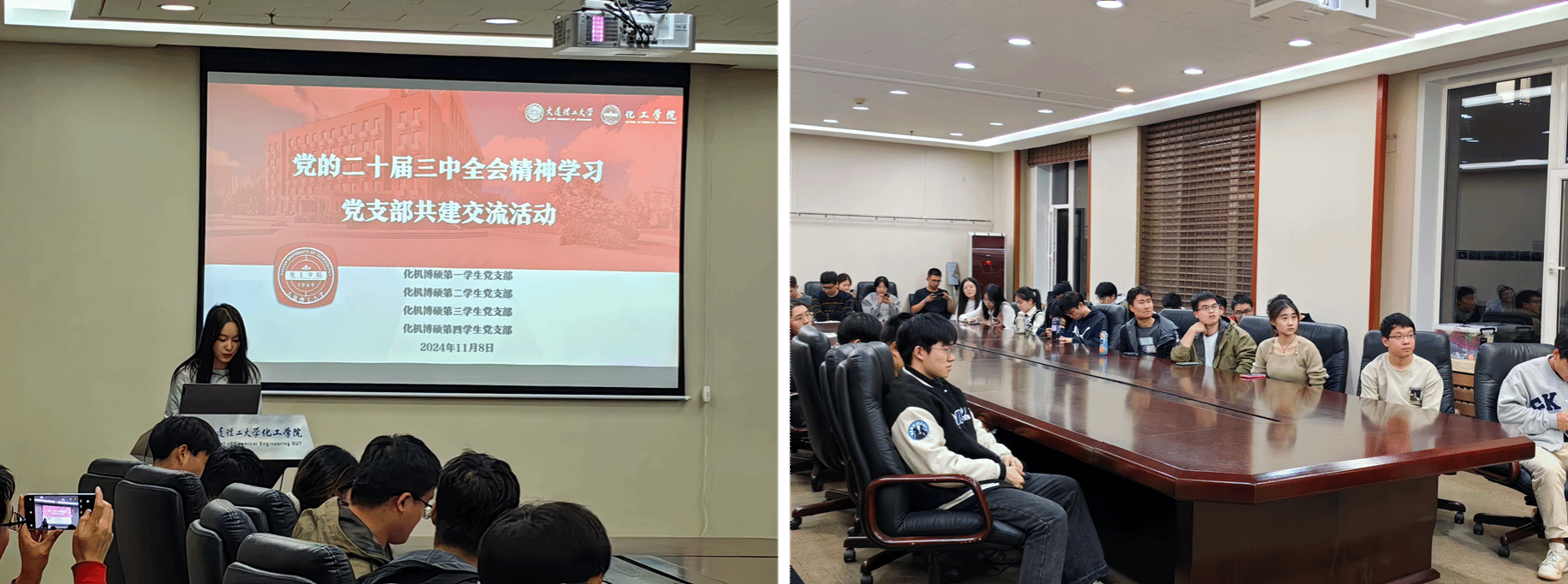 为深入学习贯彻党的二十届三中全会精神,牢牢把握进一步全面深化改革的“六个坚持”重大原则,深化对改革的认识,丰富党员理论知识,促进支部间交流共建,化工学院于11月8日在知化楼D406成功举办了第二期研究生党支部理论联学共建活动。本次活动由化机博硕第一学生党支部、化机博硕第二学生党支部、化机博硕第三学生党支部、化机博硕第四学生党支部联合举办,活动由化工党委分党校理论部王姿然、刘美希主持。