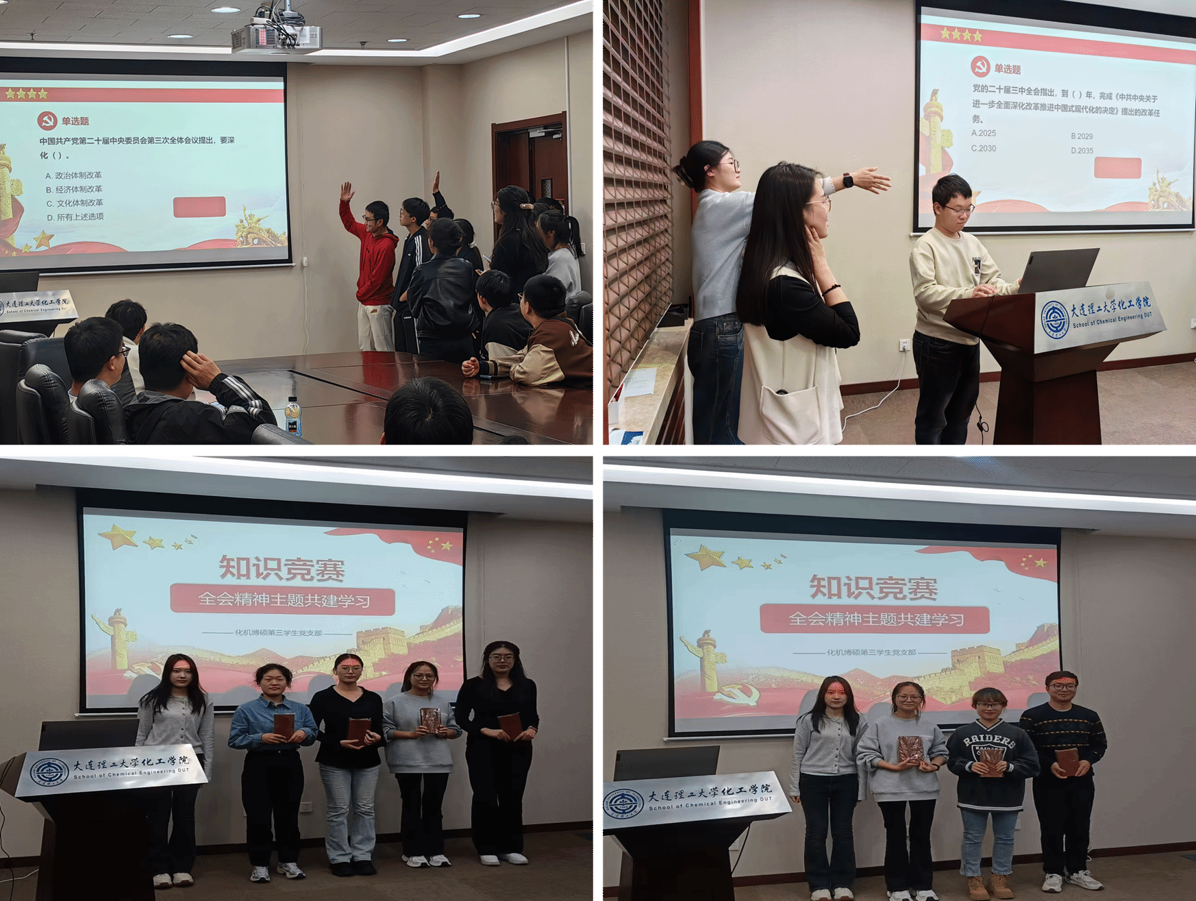 化机博硕第三学生党支部组织学习全会精神主题知识竞赛活动,活动设个人赛和团体赛两个环节。个人赛中,支部成员选派代表,上演知识和脑力的较量,选手们冷静思考、沉着应答,展现了对教育、科技、人才一体化发展的深刻理解。团体赛中,支部成员四人一组,以赛促学的同时提高了化机四个党支部成员之间的团队协作力,激发党员学习全会精神的热情和动力。经过激烈角逐,化机博硕第四学生党支部荣获团体赛冠军,化机博硕第四学生党支部杨婷、化机博硕第二学生党支部吴宏伟和化机博硕第一学生党支部马倩玉脱颖而出,分别获得一、二、三等奖。