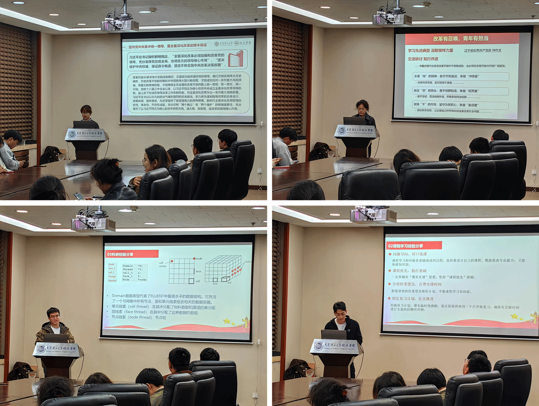 化机博硕第二学生党支部响应“改革有召唤,青年有担当”的时代呼唤,结合化工机械与安全系的特点,依次由柳子臣同志和冯卿同志带来了有关课业学习和科研工作的分享与指导。他们表示,希望以此分享为契机,勉励各位同志日后在学业、科研和生活各个方面不断创新、提升自我素质,积极投入社会实践,用实际行动支持和推动国家的改革进程。