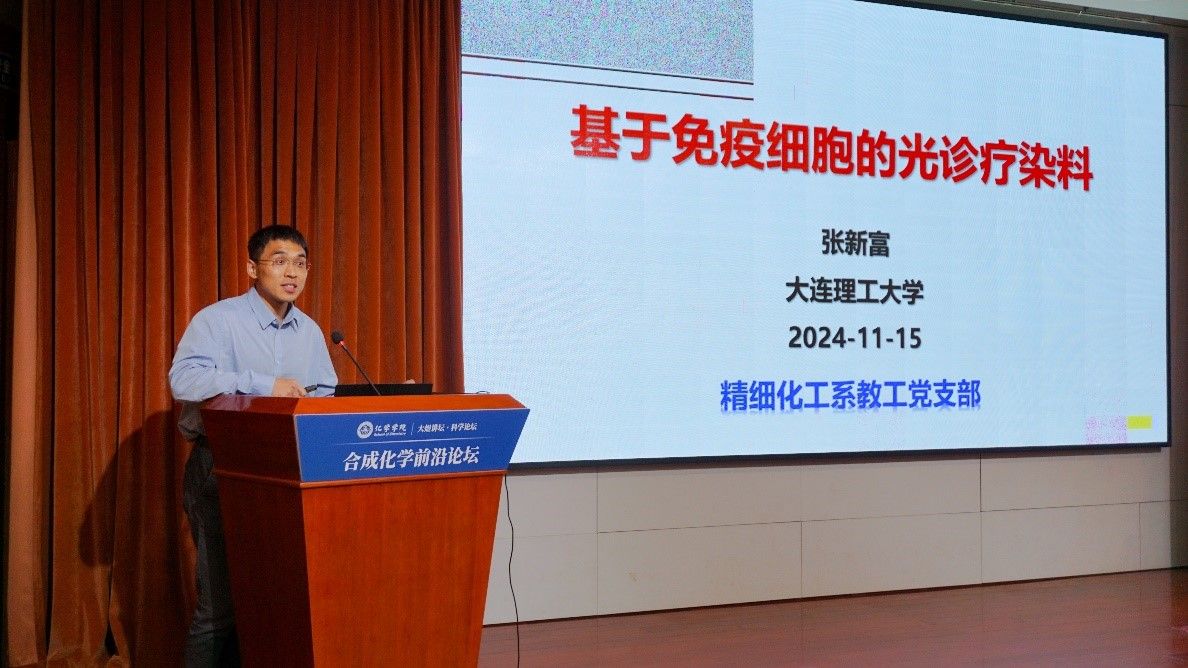 2024年10月15日下午18:00,精细化工系教工党支部、染料助剂与清洁合成博硕学生党支部、应用化学博硕学生党支部联合举办了“导师带我学理论”活动。本次活动特邀大连理工大学化工学院精细化工国家重点实验室副教授、博士生导师张新富作为主讲嘉宾。张新富老师是2024年国家优秀青年基金获得者,长期从事功能染料的设计与应用研究,具有丰富的理论积累与实践经验。本次讲座以“基于免疫细胞的光诊疗染料”为主题,探讨了功能染料在生物医疗领域的应用现状及其未来发展方向。
