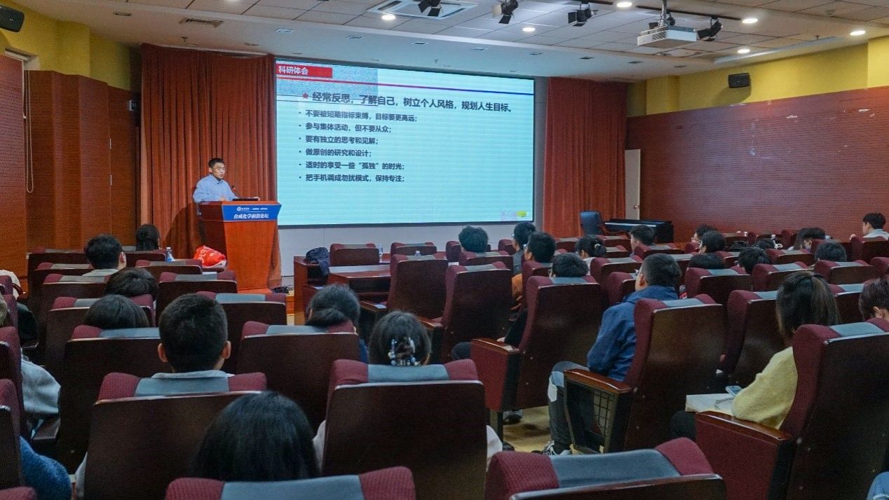 在讲解过程中,张教授结合个人研究经验,不仅分享了前沿科学的技术难点,还鼓励学生从多学科视角探索科研问题。张教授强调:“科研不仅需要扎实的理论基础,更需要不断反思与创新的勇气,才能推动科学进步。”