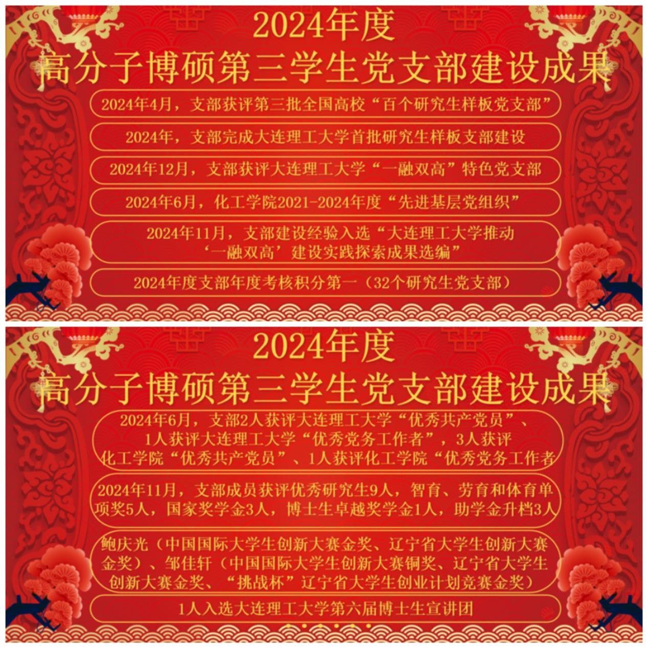 2024年,支部获评第三批全国高校“百个研究生样板党支部”(全校唯一),获评大连理工大学“一融双高”特色党支部,获评化工学院2021-2024年度“两优一先”先进基层党组织,支部建设成果经验入选“大连理工大学推动‘一融双高’建设实践探索成果选编”;支部党员获评大连理工大学2021-2024年度“两优一先”优秀共产党员2人,优秀党务工作者1人,化工学院2021-2024年度“两优一先”优秀共产党员3人,优秀党务工作者1人;支部成员获评优秀研究生9人,智育、劳育和体育单项奖共5人,国家奖学金3人,博士生卓越奖学金1人,助学金升档3人,中国国际大学生创新大赛(2024)全国总决赛金奖1项,“建行杯”辽宁省大学生创新大赛(2024)金奖1项,中国国际大学生创新大赛(2024)铜奖1项,“建行杯”辽宁省大学生创新大赛(2024)金奖1项、2024年“挑战杯”辽宁省大学生创业计划竞赛金奖1项,1人入选大连理工大学第六届博士生宣讲团。支部共表彰支部出勤、志愿服务、科技创新、2024年大连理工大学优秀研究生、2024年大连理工大学单项奖、2024年国家奖学金、博士生卓越奖学金、2024年特别贡献奖7部分61人次,切实做到树立典型,持续发挥党员模范带头作用。