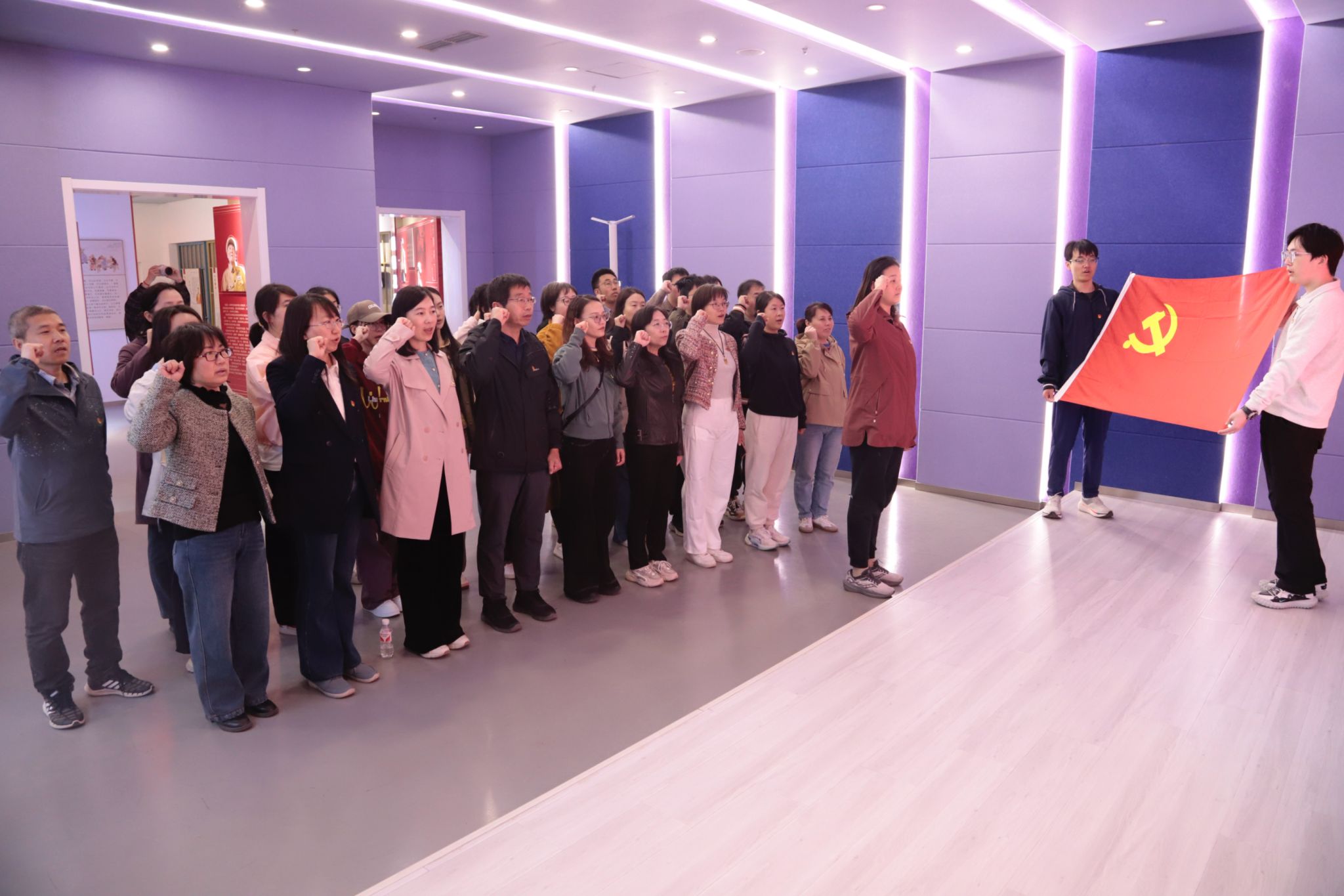 参观期间,全体党员面对鲜红的党旗,共同举起右拳,再一次重温入党誓词。
