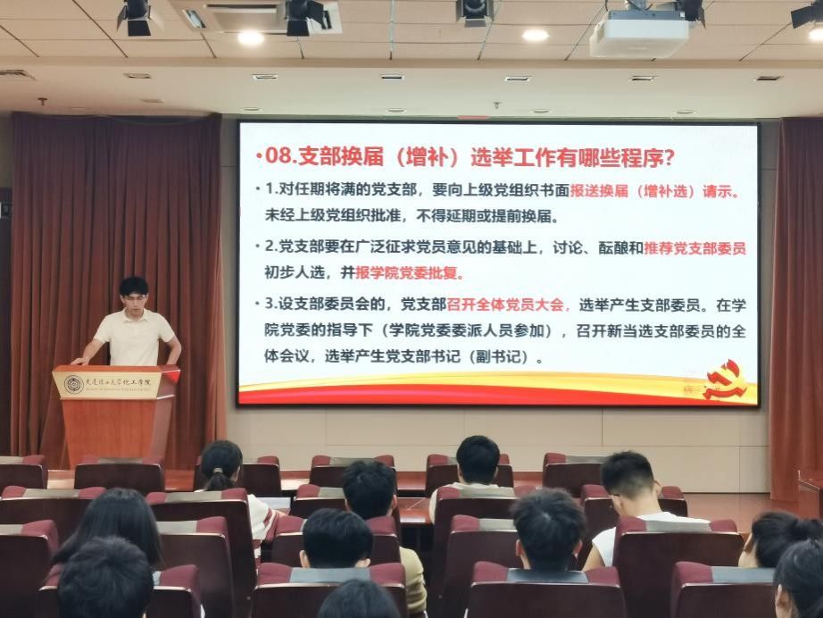为深入贯彻新时代党的建设总要求,持续推进基层党支部标准化、规范化建设,全面提升学生党支部书记履职能力和基层党支部组织力,2025年9月10日,化工学院党委在知化楼D102会议室成功举办“红领培育・精研实干”学生党支部书记业务培训会。本次培训聚焦党支部工作实际需求,围绕增补选举程序、党员发展等党务工作的关键环节开展系统讲解与实操指导。通过精准解读制度要求、明确增补选举流程,进一步强化学生党支部书记的业务素质和履职能力,切实提升基层党支部组织力和规范化水平,推动制度要求落地见效。