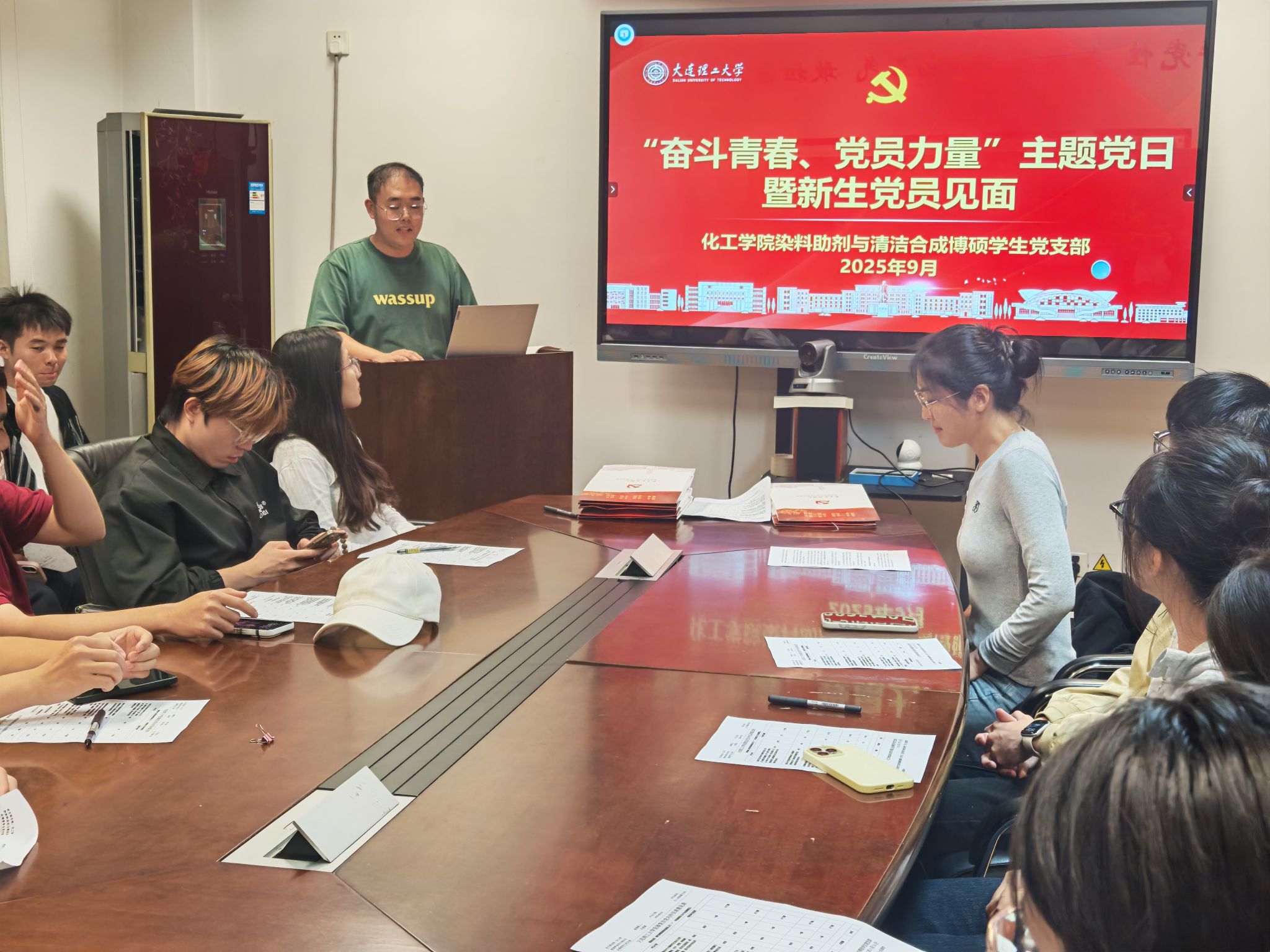 为增强党组织凝聚力,引导新生党员快速融入组织生活,明确党员责任,染料助剂与清洁合成博硕学生党支部、染料助剂与清洁合成博学生团支部、硕第一学生团支部和硕第二学生团支部于2025年9月26日在化工实验楼G101会议室开展了“奋斗青春、党员力量”主题党日活动暨党团共学活动。本次活动严格遵循议程,内容充实,环节紧凑,取得了预期效果。