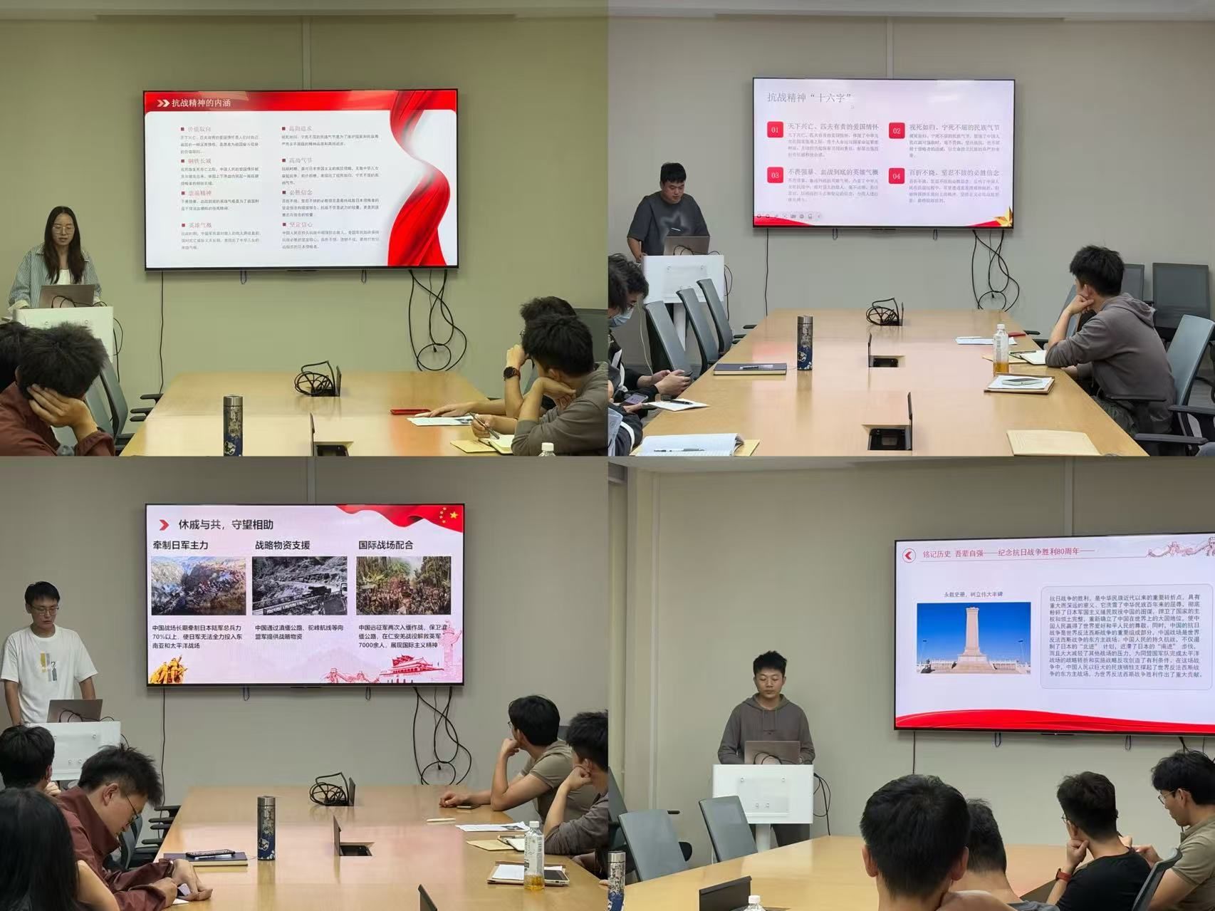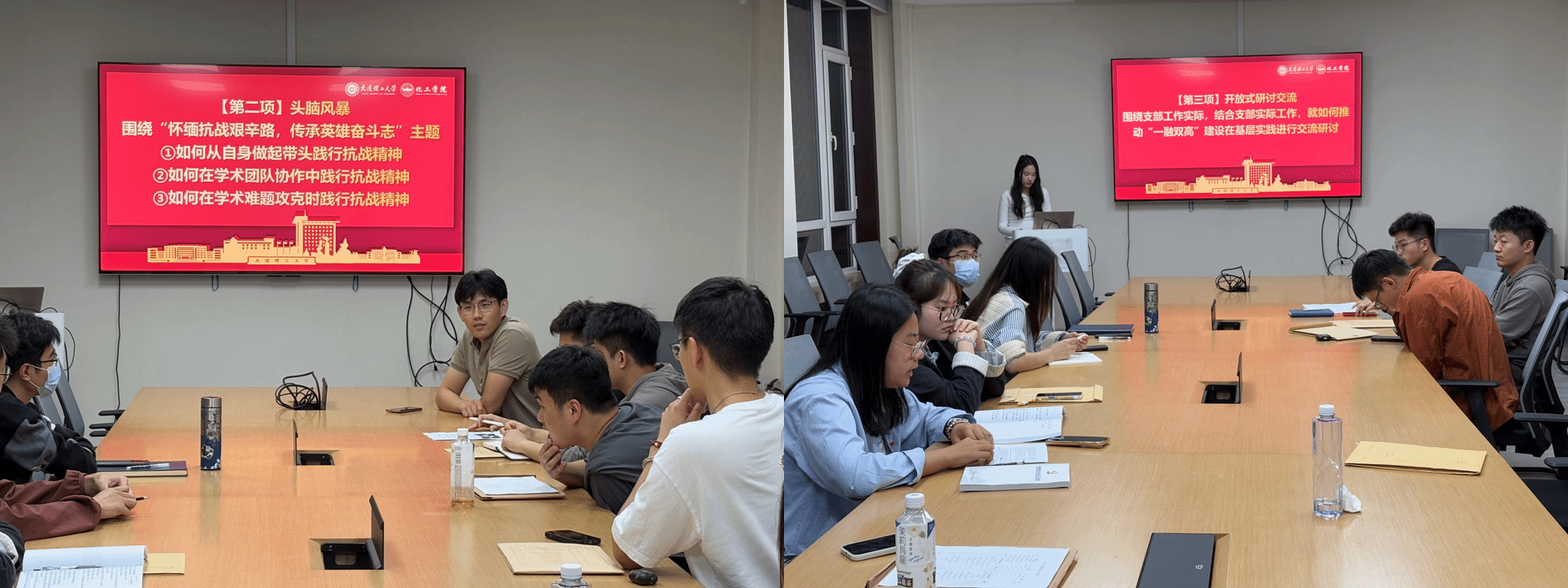 在研讨交流环节,首先由学院党办王玉健老师以“如何从自身做起带头践行抗战精神”为切入点,结合个人经历分享感悟。他强调,研究生党员需进一步筑牢党的理想信念、厚植对党的赤诚热情,在自我审视与实践中找准思想成长突破点,为践行抗战精神奠定思想根基。各支部围绕“缅怀抗战艰辛路,传承英雄奋斗志”核心主题,聚焦三大方向深入交流:一是“如何从自身做起带头践行抗战精神”,二是“如何在学术团队协作中践行抗战精神”,三是“如何在攻克学术难题时践行抗战精神”。与会党员积极发言、热烈研讨,结合科研与生活实际分享思考,提出诸多兼具思想性与实操性的见解,让抗战精神在学术场景中得到生动诠释。