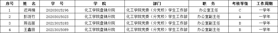 2022-2023学年对全体在编且工作时间不少于半学年的学生干部进行了考核,考核结果如下, 如对公示的考核成绩存在异议,请在公示期内与负责考核的指导教师进行沟通、解决。