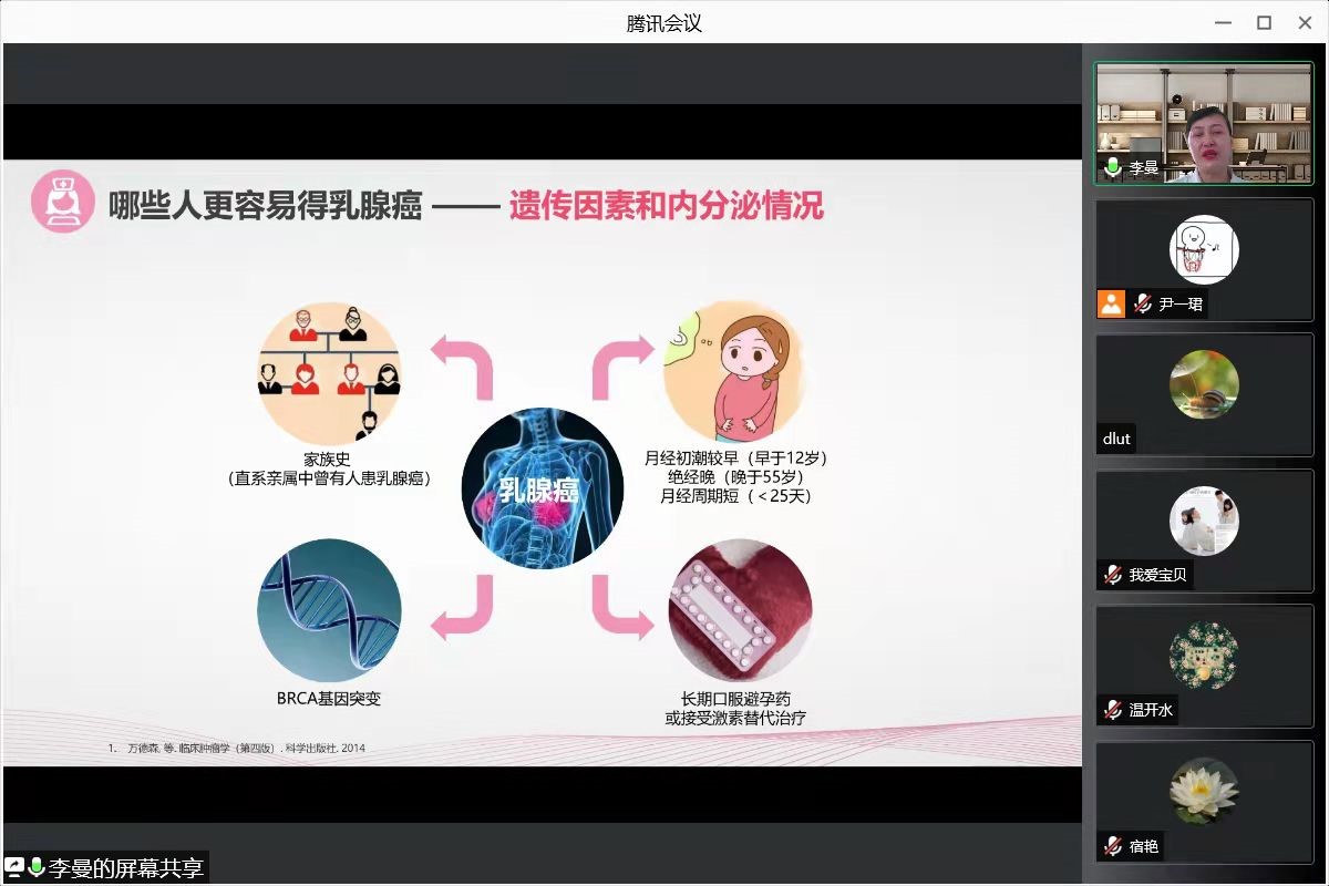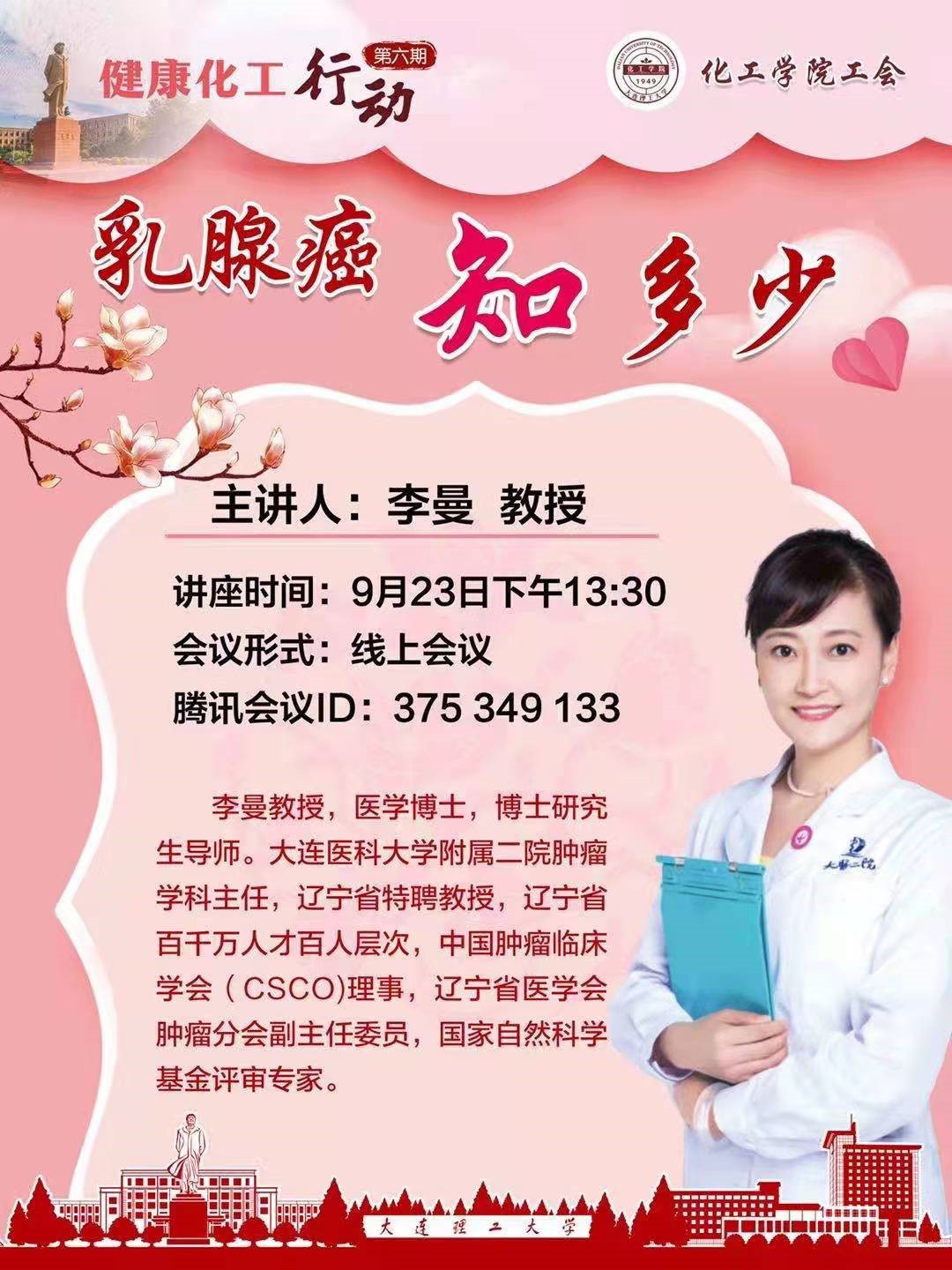 为进一步响应党中央关于建设健康中国的目标,化工学院工会于9月23日下午召开“健康化工行动”——乳腺癌知多少 主题讲座,本次活动由大连医科大学附属二院肿瘤学科主任李曼教授主讲,讲座由化工学院工会副主席尹一珺主持,通过腾讯会议开展线上讲座,学院及兄弟单位感兴趣的教职工参与了本次讲座。