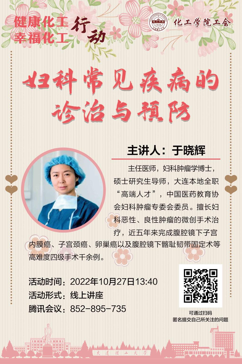 近年来,关于女性健康的话题渐成社会焦点,一些妇科疾病的发病率逐年增高,严重影响了广大妇女的身心健康,甚至威胁到生命。为了使学院女教工更加了解妇科常见疾病相关知识,化工学院工会于10月27日开展“健康化工行动”第七期——《妇科常见疾病的诊治与预防》专题讲座。活动邀请了大连市妇女儿童医疗中心春柳妇产院区妇三病房科主任于晓辉作为主讲人,共有来自学校近70名女教工参与到本次活动中。