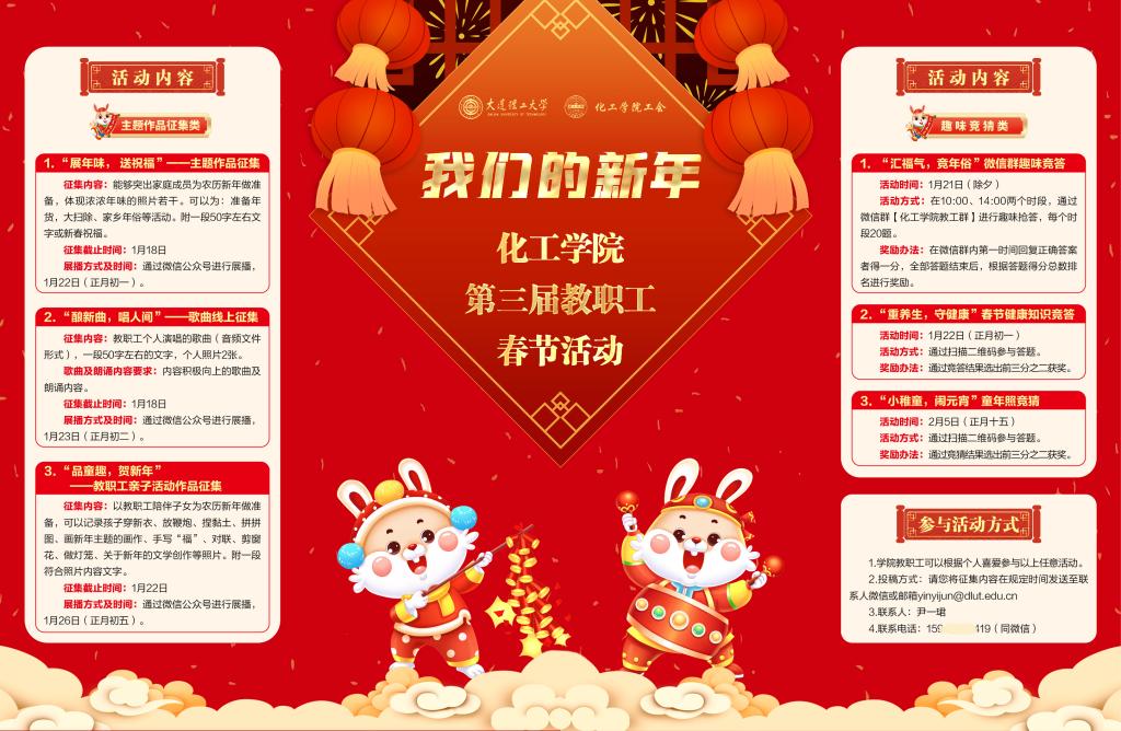 灵兔跃动而至,携来新岁美愿。新春佳节期间,为弘扬和传承中华民族传统文化、丰富教职工业余文化生活,营造欢乐祥和、喜庆热烈的节日氛围,化工学院工会举办了“我们的新年”第三届教职工春节系列活动。本次活动共包含主题作品征集及知识竞答共6项子活动,历时近一个月,自农历小年一直延续到元宵佳节,学院近300名教职工参与了本次活动,大家通过线上的方式欢聚一堂,互赠祝福,共同迎接农历兔年的到来。