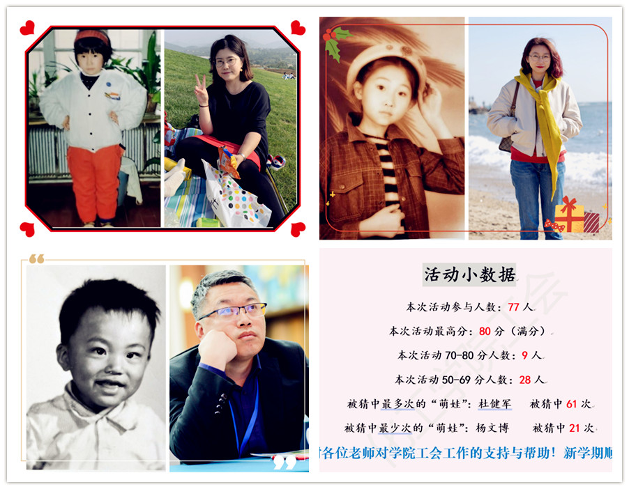 学院工会延续往届最受欢迎的节目,在正月十五元宵节当天举办了“小稚童,闹元宵”童年照竞猜活动。学院工会收集到了8位老师的童年照,通过问卷的形式开展,共77名学院教师参与其中。看着一张张稚气的面庞,大家纷纷展开讨论,认真辨别是身边的哪一位老师。学院教职工热热闹闹的节日氛围中共同欢度元宵佳节。