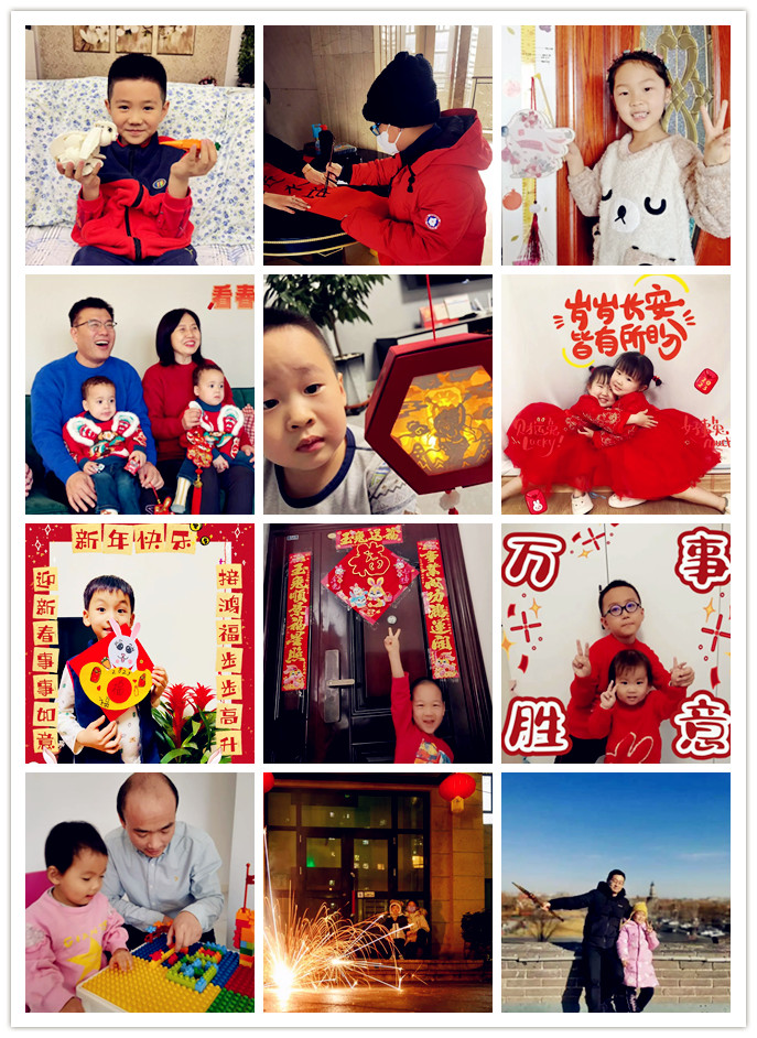 为了迎接春节,可爱的孩子们穿上了新衣服,在父母的陪伴下做灯笼、剪窗花、写福字、贴春联、放鞭炮,以巧手绘新春,在欣赏、感知、参与、体验中,加深对春节的理解,感受中国年的独特韵味。在“品童趣,贺新年”亲子活动作品征集中,小萌娃们纷纷出镜,向大家展示了自己完成的兔年元素的积木、独立书写的春联、与父母共同完成的兔子花灯、黏土作品等等….充满童趣,中华民族的优秀传统文化在教职工与子女点点滴滴的爱与陪伴中走进了孩子们的心房。