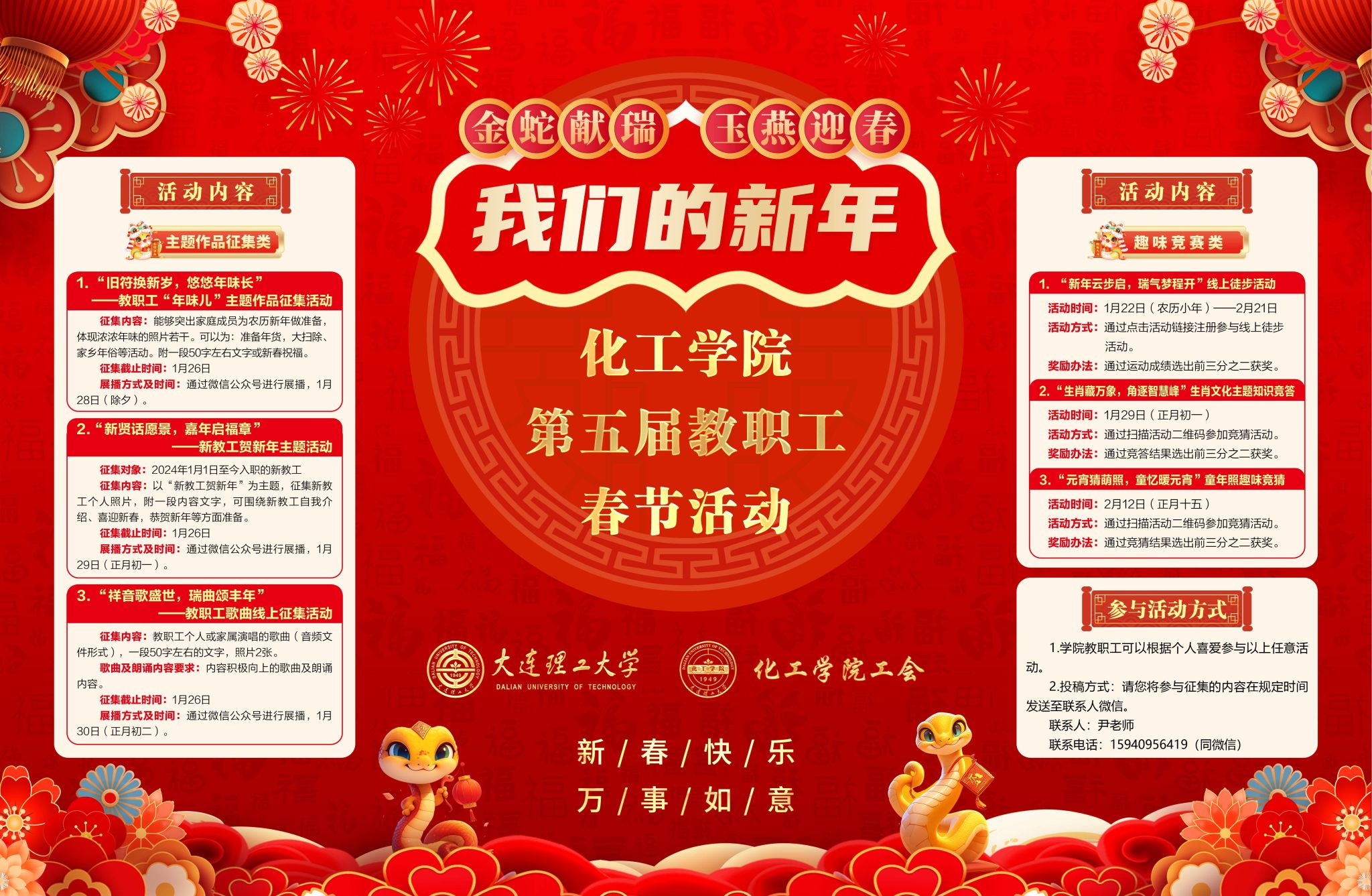金蛇献瑞,玉燕迎春。在辞旧迎新的美好时刻,我们迎来了充满希望与生机的蛇年春节。为弘扬和传承中华民族传统文化,丰富教职工业余文化生活,营造欢乐祥和、喜庆热烈的节日氛围,化工学院工会在农历春节期间举办了“我们的新年”化工学院第五届教职工春节活动。本次活动共包含主题作品征集及趣味竞赛共6项子活动,自农历小年启动,一直持续到元宵佳节,共有388人次参与其中。大家通过线上的方式欢聚一堂,互赠祝福,分享快乐,共同迎接农历新年的到来。