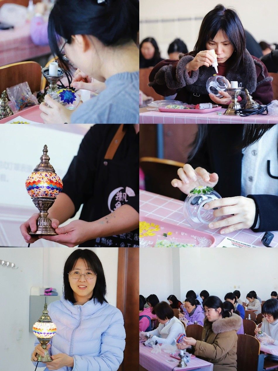 步入活动现场,温馨雅致的氛围扑面而来——柔和的灯光倾洒而下,桌上五彩斑斓的马赛克碎片与精致的灯罩工具错落有致,仿佛在静静等待着创作者们的巧手点化。活动特邀专业手工老师从马赛克艺术的起源讲起,生动细致地为大家讲解光影构成、色彩搭配与镶嵌技巧。手作环节,大家在操作台前,小心翼翼地拿起彩片,耐心粘贴。经过精心拼接,它们都绽放出独一无二的光彩。当一盏盏亲手制作的马赛克灯被点亮,柔和的光芒透过斑斓的琉璃漫溢开来,整个空间都被温暖的光影所笼罩,女教师们的笑靥也在光影中格外动人。