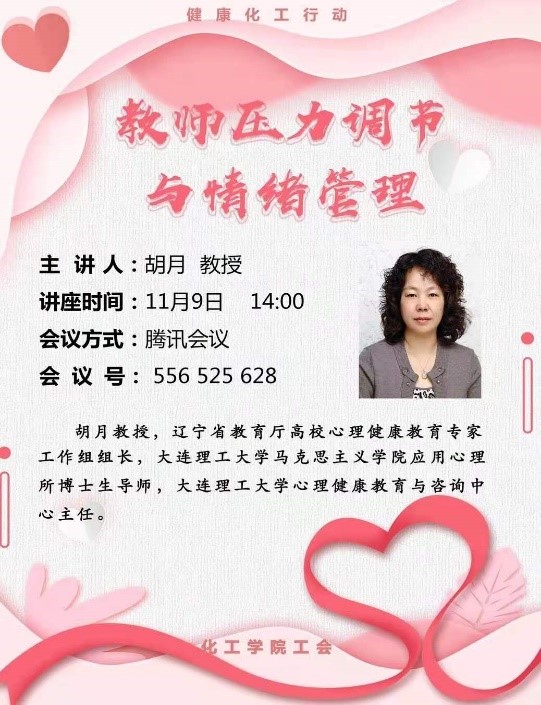 为进一步响应《健康中国行动》,化工学院工会于11月9日14点召开“健康化工行动——教师压力调节与情绪管理”线上主题讲座,并邀请“大连理工大学心理健康教育及咨询中心主任——胡月教授”作为本次讲座的主讲人,讲座由化工学院工会专干尹一珺主持,通过腾讯会议开展线上讲座,共有来自学院及兄弟院系近百名教职工参与了本次讲座。