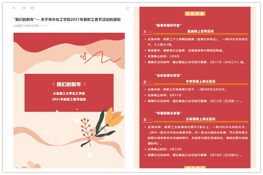 据悉,本次活动共有“新春送福拜年歌”、“党史校史我知道”、“吉祥如意年夜饭”、“幸福团圆全家福”、“欢乐猜灯谜 喜庆闹元宵”5项内容。其中,线上作品征集活动3项,通过学院微信公众号进行展播,知识竞猜2项,依托化工学院教工微信群、线上问卷软件来完成。自农历小年为一直延续到元宵佳节。