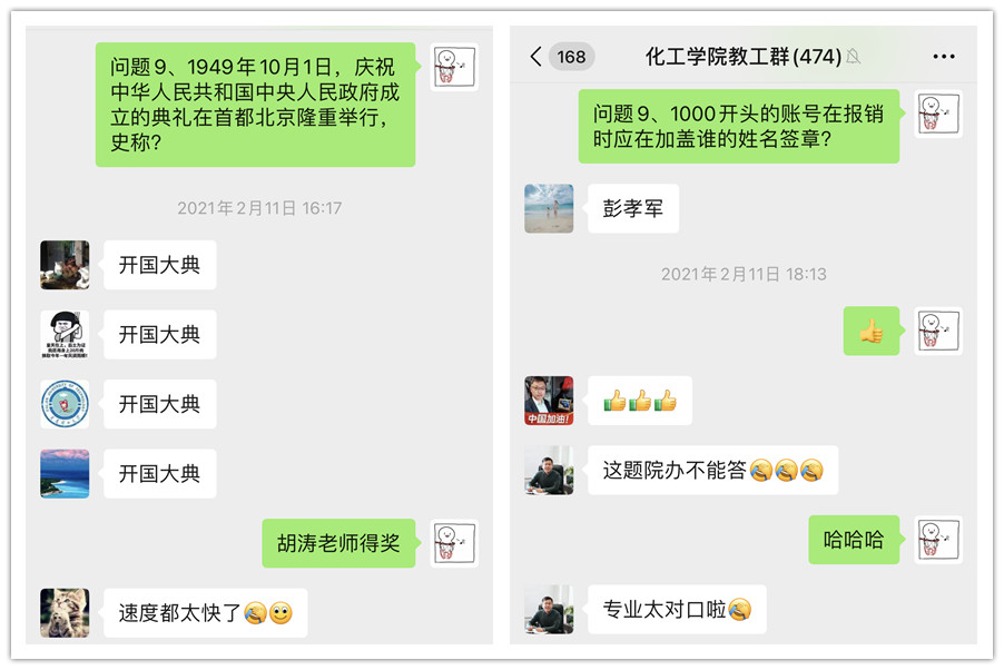 学院工会在大年三十除夕夜,通过化工学院教工微信群开展了线上有奖竞猜活动。问题涵盖四史、校史、院史等知识,更有化工伉俪大搜集等趣味题目。教职工纷纷进行抢答,拼网速,拼手速,微信群内消息连连,热闹非凡。