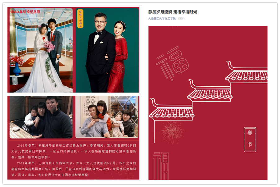 岁月变迁,温情不变。新春佳节里,一张张“全家福”充满了仪式感,有家庭的变化、有家风的传承、有团圆的滋味;一张张“全家福”汇聚幸福事、浓缩奋斗史,承载着全家人温暖的回忆。学院教授都健、孟庆伟夫妇晒出了两人当年的结婚照以及结婚三十周年的纪念照,并在寄语中写道:“回顾毕业三十年来的风风雨雨,今非昔比,双鬓白发,虽为社会做出了应有的贡献,也可谓桃李满天下,但更为感慨的是感谢母校对我们的培养与教育,在创“双一流”的道路上我们会继续一起拼搏,做永远的“大工人”、“化工人”。许多像他们一样的教师扎根大工,亲身经历了大工的建设发展,为大工奉献,为国家的教育事业添砖加瓦。而此时,像刘毅老师一样的年轻教师也不断汇聚大工大家庭,为学校建设注入生机和力量。正是这样一个个充满爱的小家汇聚形成了大工大家庭,而大工同样也给了这些小家信心和支撑,让教职工们全身心投入科研和教学任务,为国家的教育事业而奋斗不息。