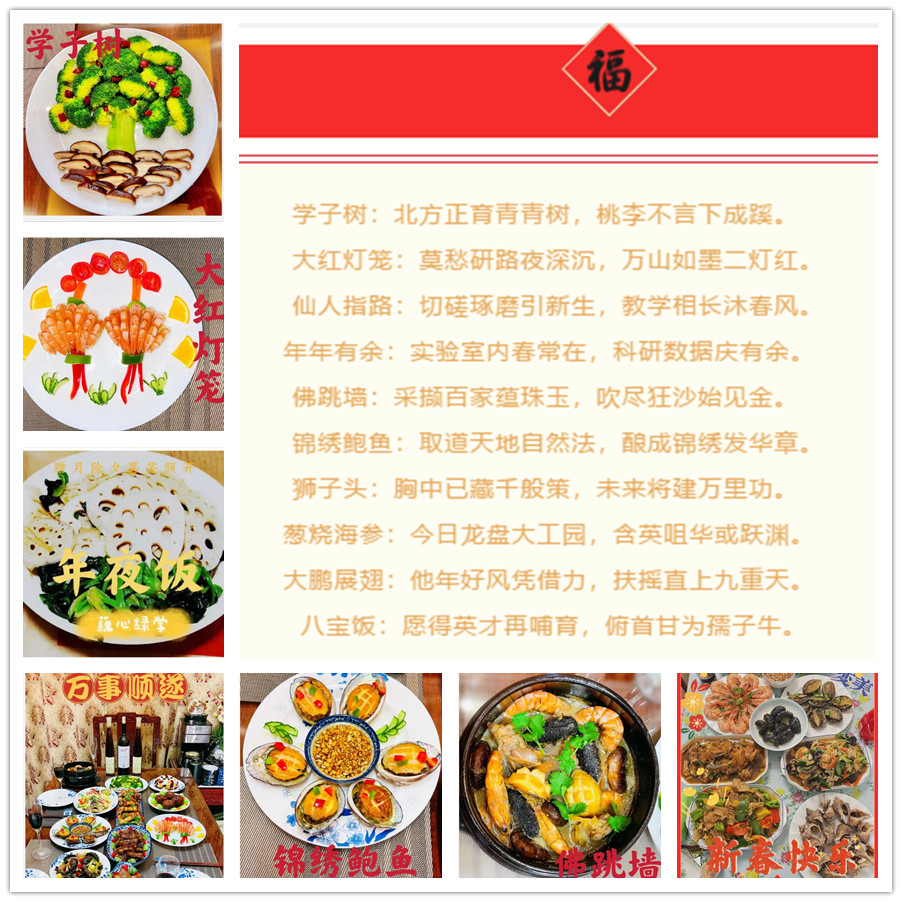 每一张照片,每一道菜,寄托的不仅是教职工们对来年的美好祝愿,也饱含着对全校师生的新年祝福。高分子与材料系郑楠老师家的年夜饭,可谓是色香味及美好寓意俱全,每一道菜均由郑楠的先生—药学系宋汪泽教授题名,并赋予深切的寓意,每一道菜都蕴含着对全体学子的祝福,可谓是情真意切。学院工会主席刘阅老师家的年夜饭也别具特色,附上了充满美好寓意的名字,传递了对大工师生的祝福。通过“云”欣赏年夜饭,传递了教职工对美好生活的向往和祝福。