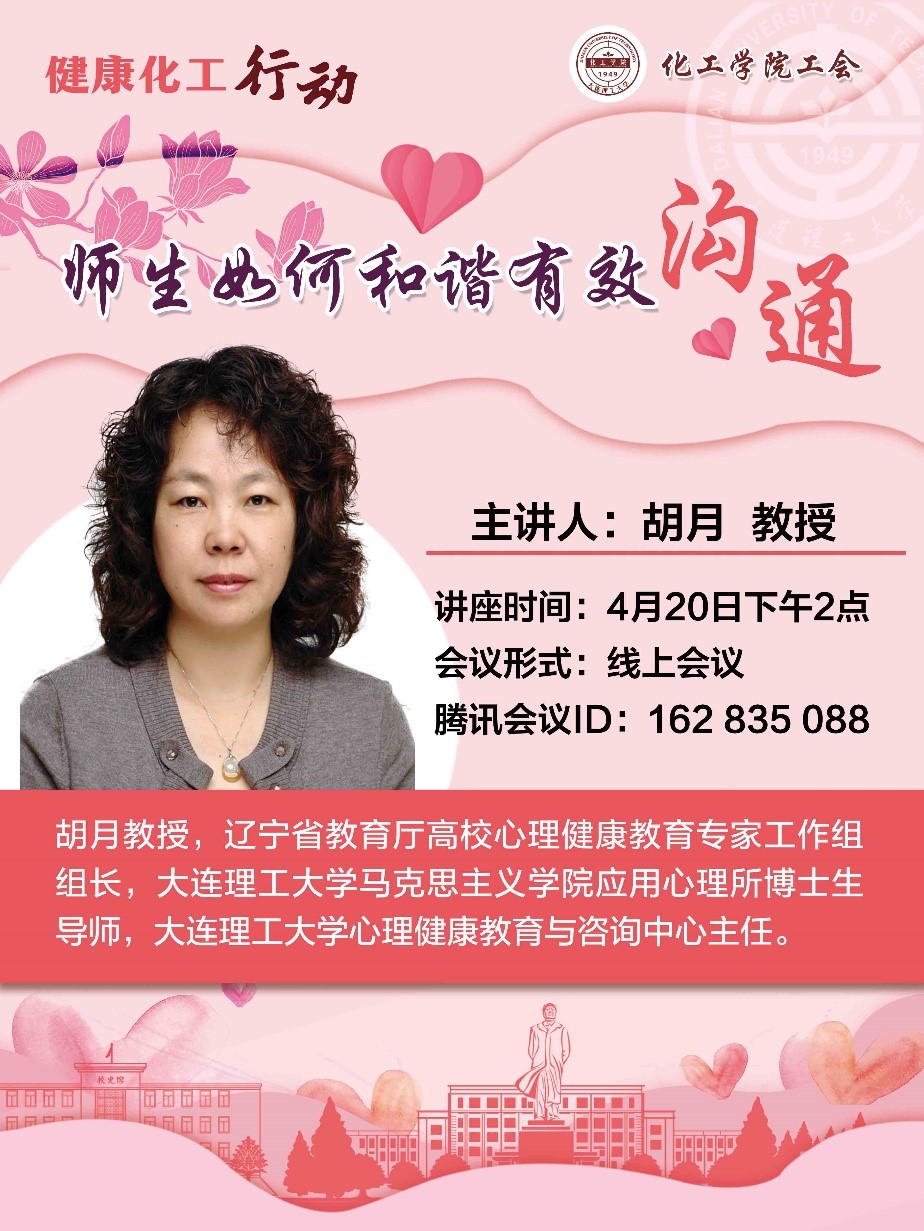 为进一步响应《健康中国行动》,化工学院工会于4月20日14点召开“健康化工行动——师生如何和谐有效沟通”线上主题讲座,邀请到大连理工大学心理健康教育及咨询中心主任——胡月教授作为主讲人,讲座由化工学院工会副主席尹一珺主持,通过腾讯会议开展线上讲座,共有来自学院及兄弟院系五十余名教职工参与了本次讲座。