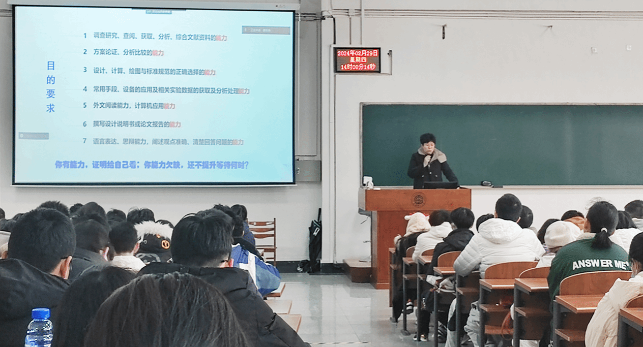首先,李琳结合学校关于2024届毕业设计(论文)工作安排,给同学们介绍了学院对本科生的培养目标,强调了本科毕业设计(论文)的重要意义以及传达了教育部的论文抽检要求,详细讲解了本科毕业设计(论文)的规范要求、目标流程、师生职责、成绩构成、进度安排以及相对应的关键时间节点等内容。围绕为什么要做好毕业设计(论文)、怎样做好毕业设计(论文)等主题内容向同学们做了深度的解读,同时希望同学们能够积极主动多与导师交流,做到真正踏实做事、认真做研究,高质量完成本科阶段最后一门课 —— 毕业设计(论文)。